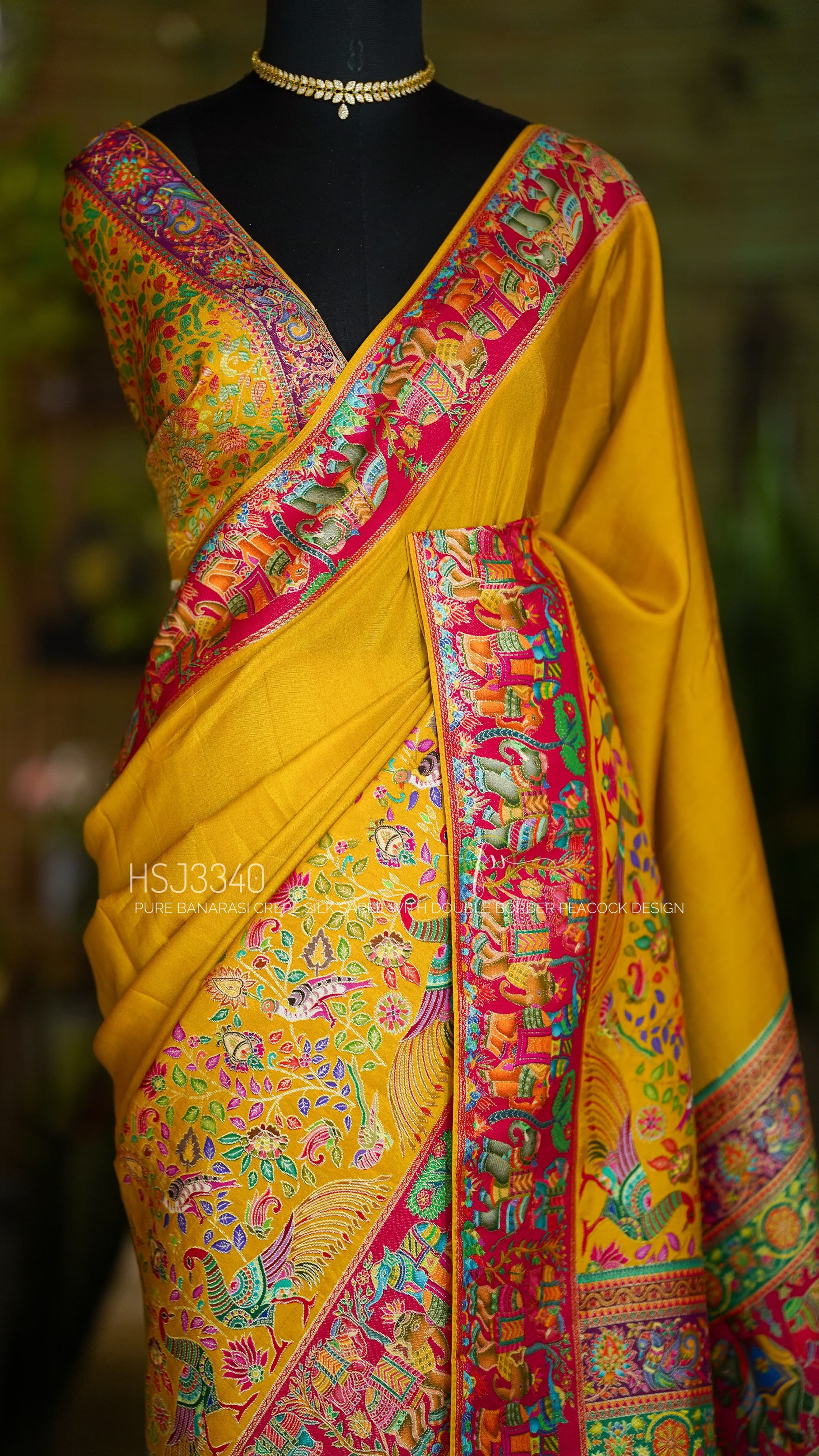 | Product Name | Designer Pure Banarasi Crepe Silk Saree In Mustard Yellow With Peacock Design Double Border |
