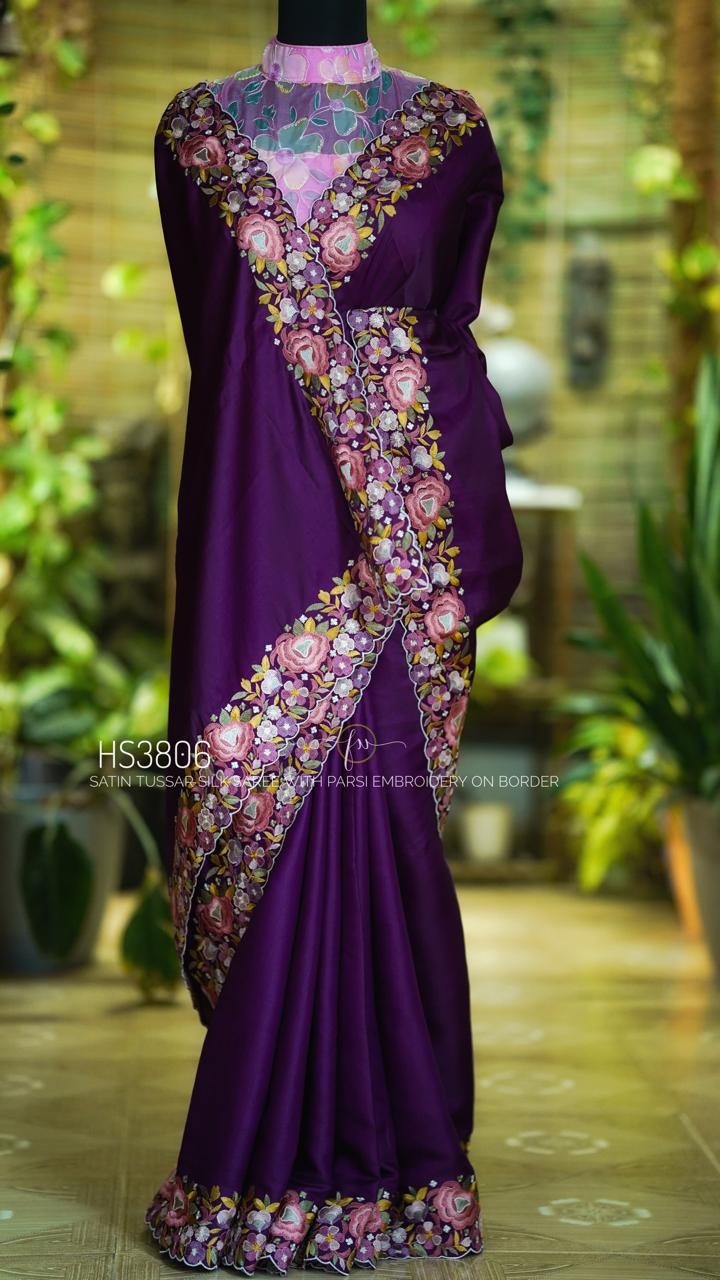 | Product Name | Heavy Parsi Embroidered Beautiful Satin Tussar Silk In Wine With Pink Floral Blouse Piece |