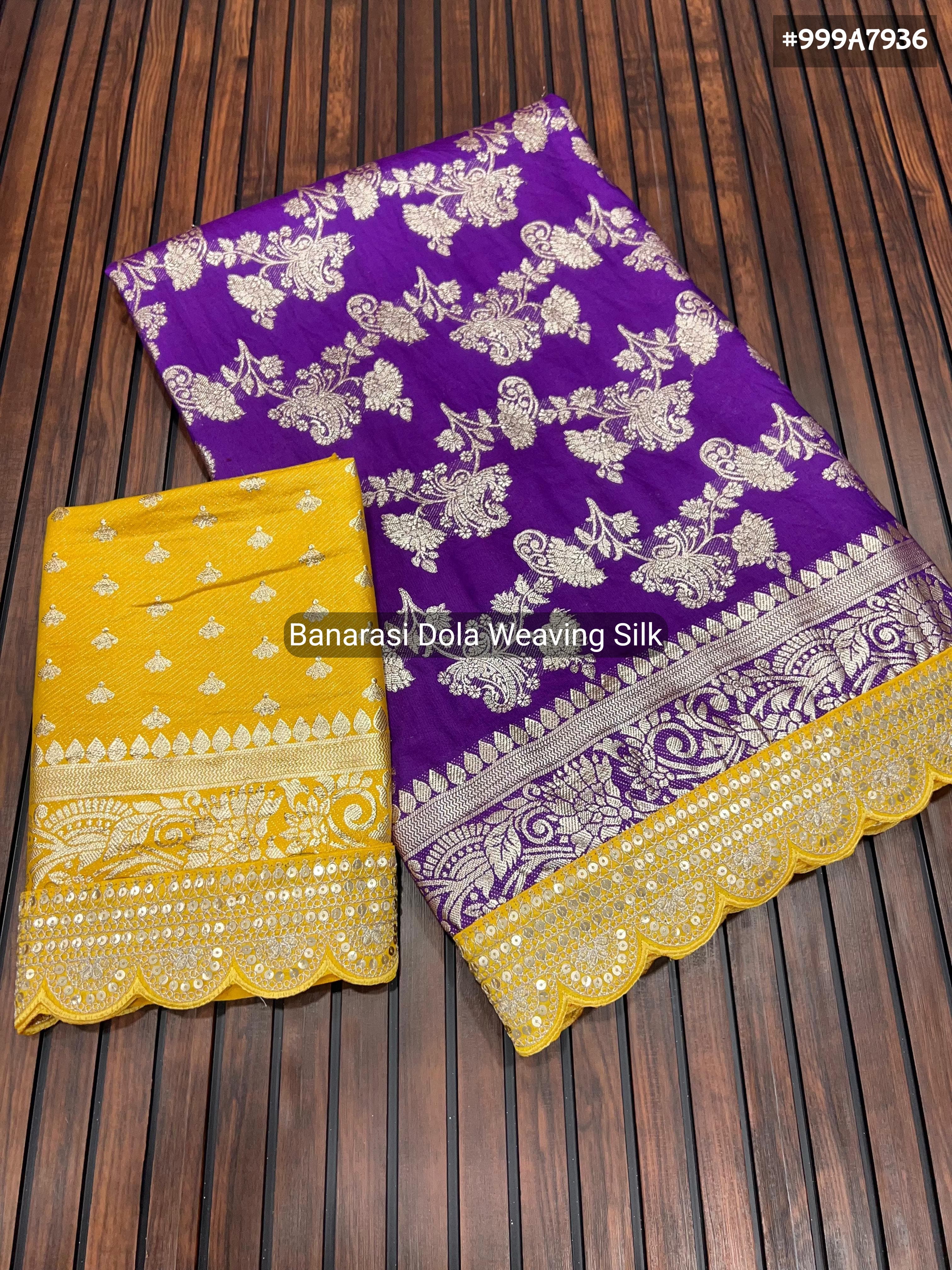 | Product Description | Pure Banarasi Dola Pattu Weaving Saree In Purple Blouse -Contrast Blouse With Weaving. Buttis And Attached border Banarasi Silk Comes From Varanasi, An Ancient City Which Is Also Called Benares (Banaras). These Sarees Are Among The Finest Sarees In India And Are Known for Their Gold And Silver Brocade Or Zari, Fine Silk And Opulent Embroidery. The Sarees Are Made Of Finely Woven Silk And Are Decorated With Intricate Design. Because Of These Engravings They Are Relatively Heavy. Most Commonly Worn In Weddings, Festivals and Special Occasions. Note : color may vary slightly due to photography and display strictly no exchange or return for color variations unpacking video must for any sort of complaint |