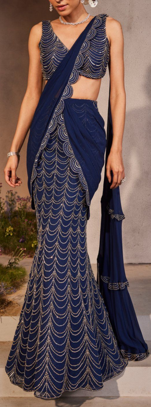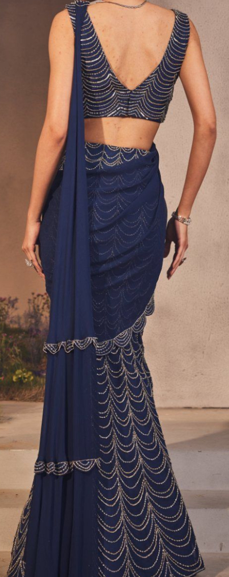 A Unique Stitched Embroidered Net Embellised Saree In Midnight Blue