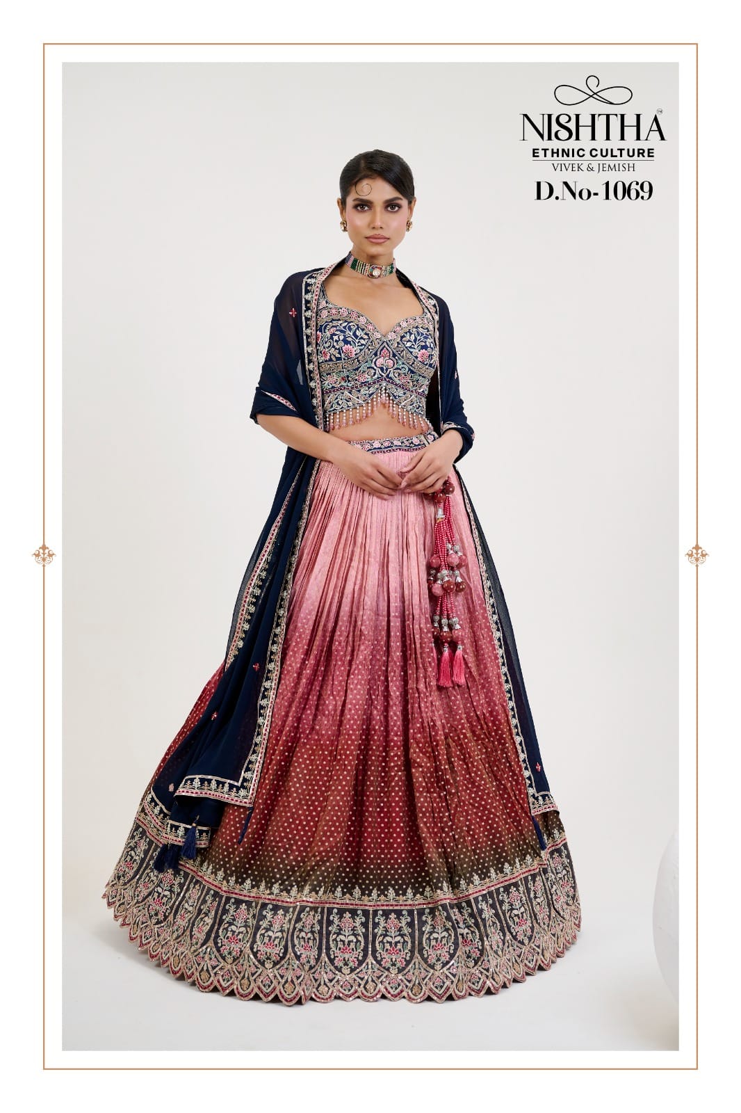 Designer Jacquard Lehenga In Black- Shaded Pink With Embroidered & Print Blouse. Comes With Georgette Dupatta