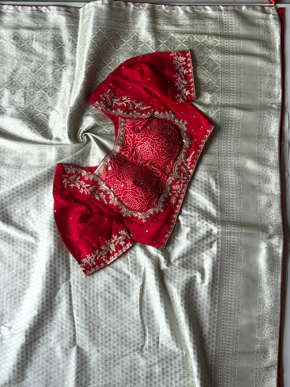 Designer Premium Banarasi Silk Dyed Saree In Ivory-Red With Contract Piping Border And Stitched Blouse