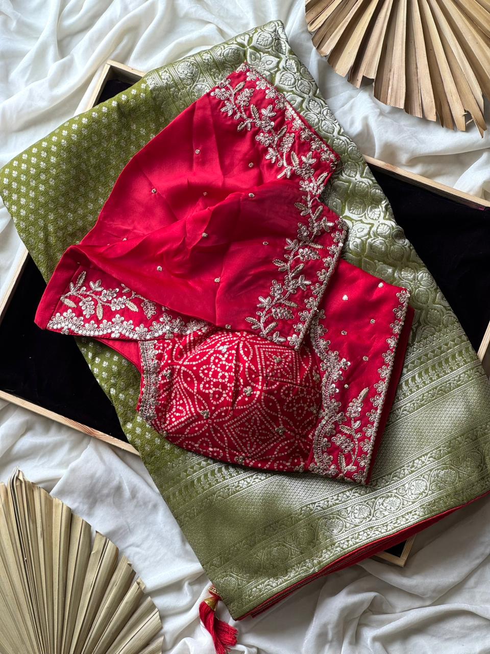 Designer Premium Banarasi Silk Dyed Saree In Olive Green-Red With Contract Piping Border And Stitched Blouse