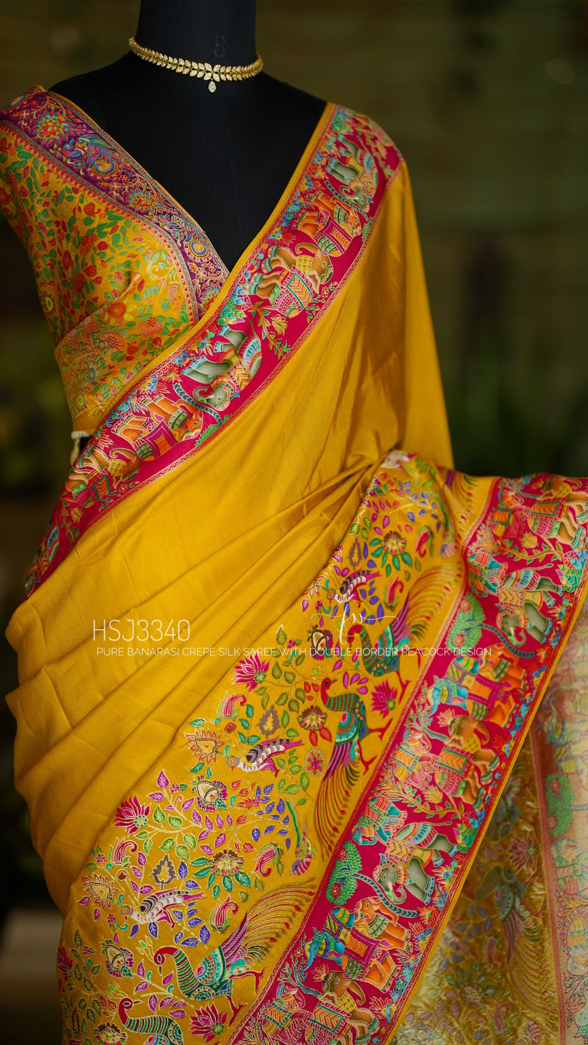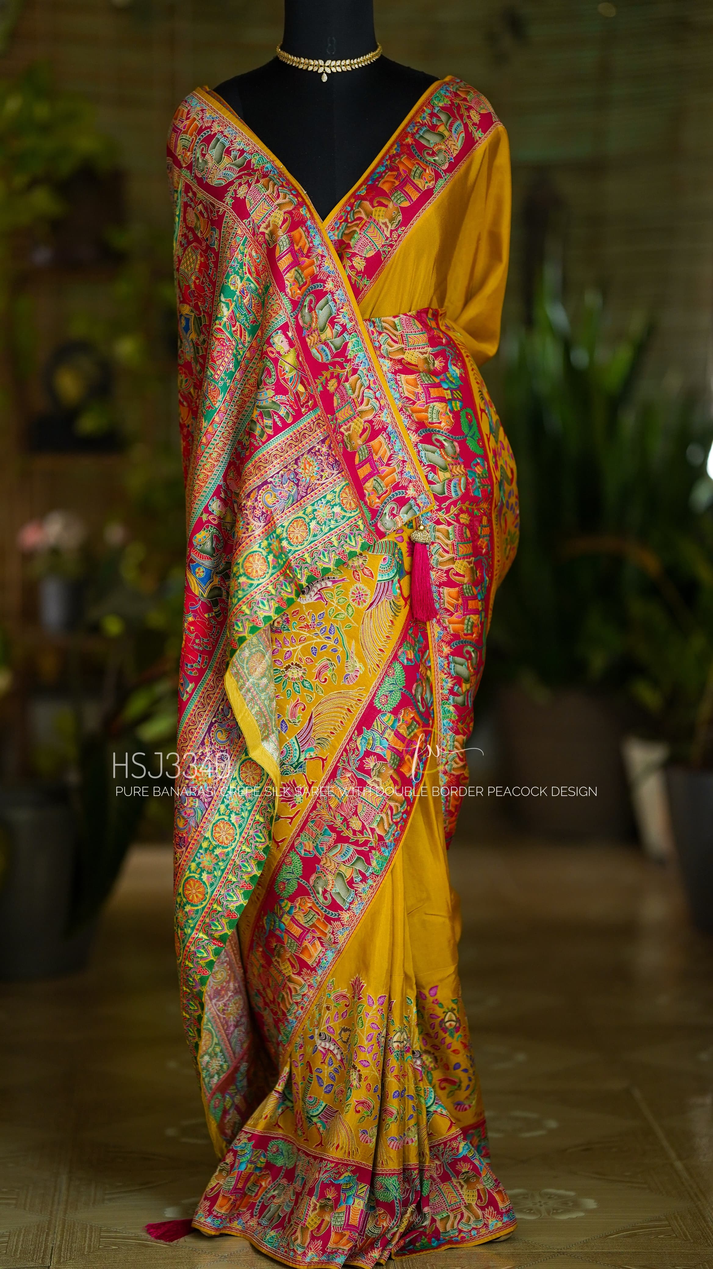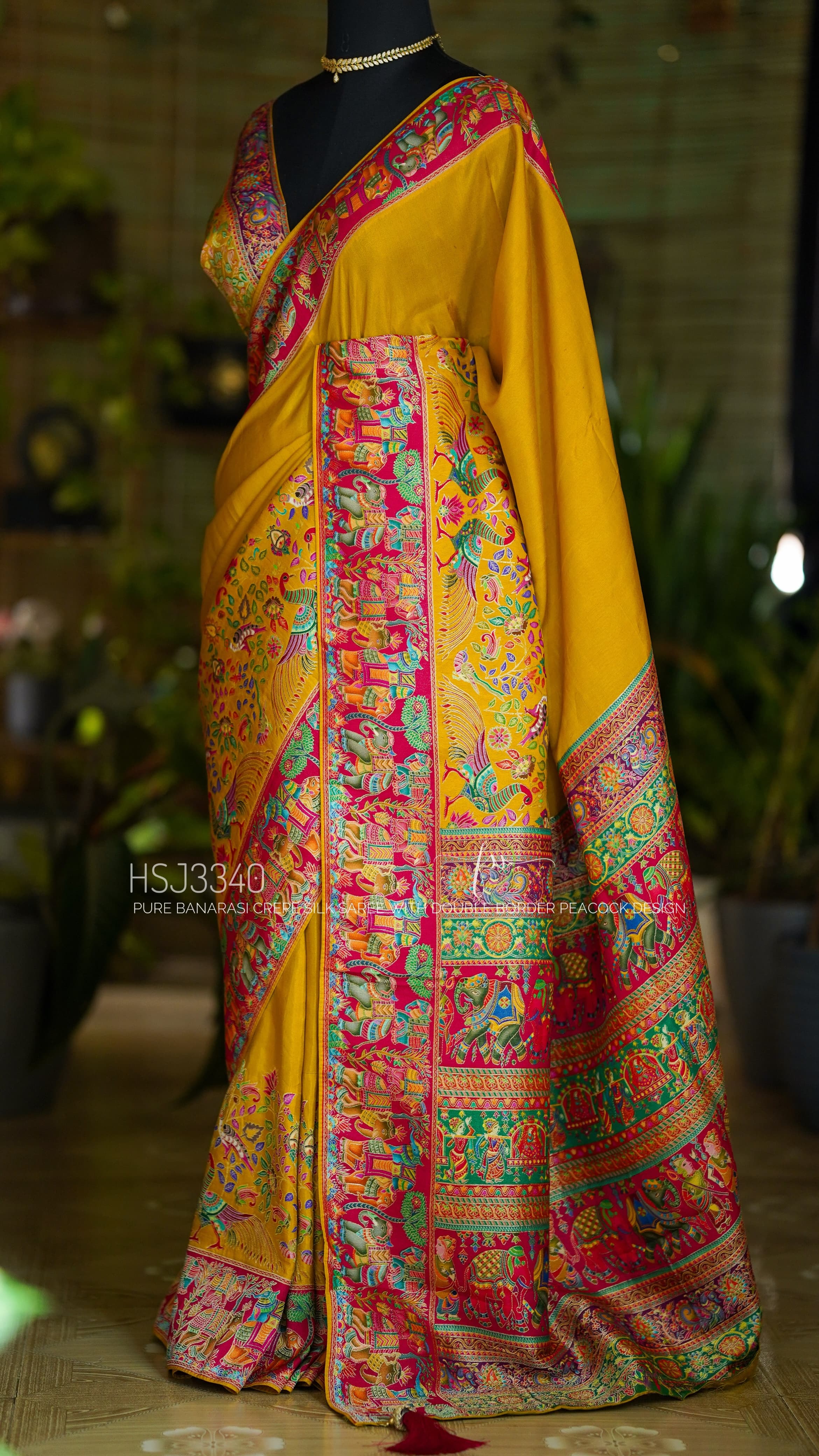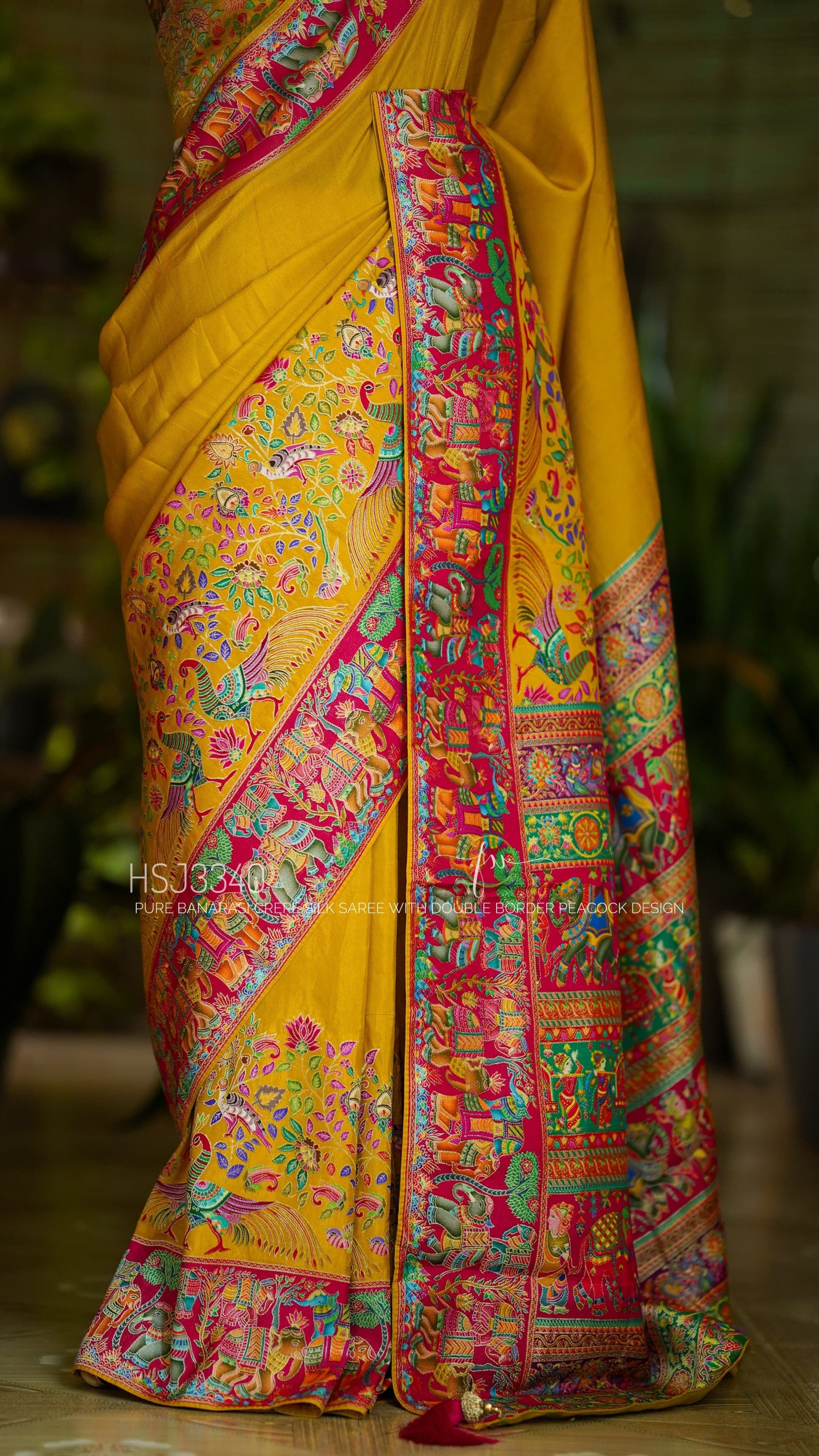 Designer Pure Banarasi Crepe Silk Saree In Mustard Yellow With Peacock Design Double Border. Comes With Stitched Blouse
