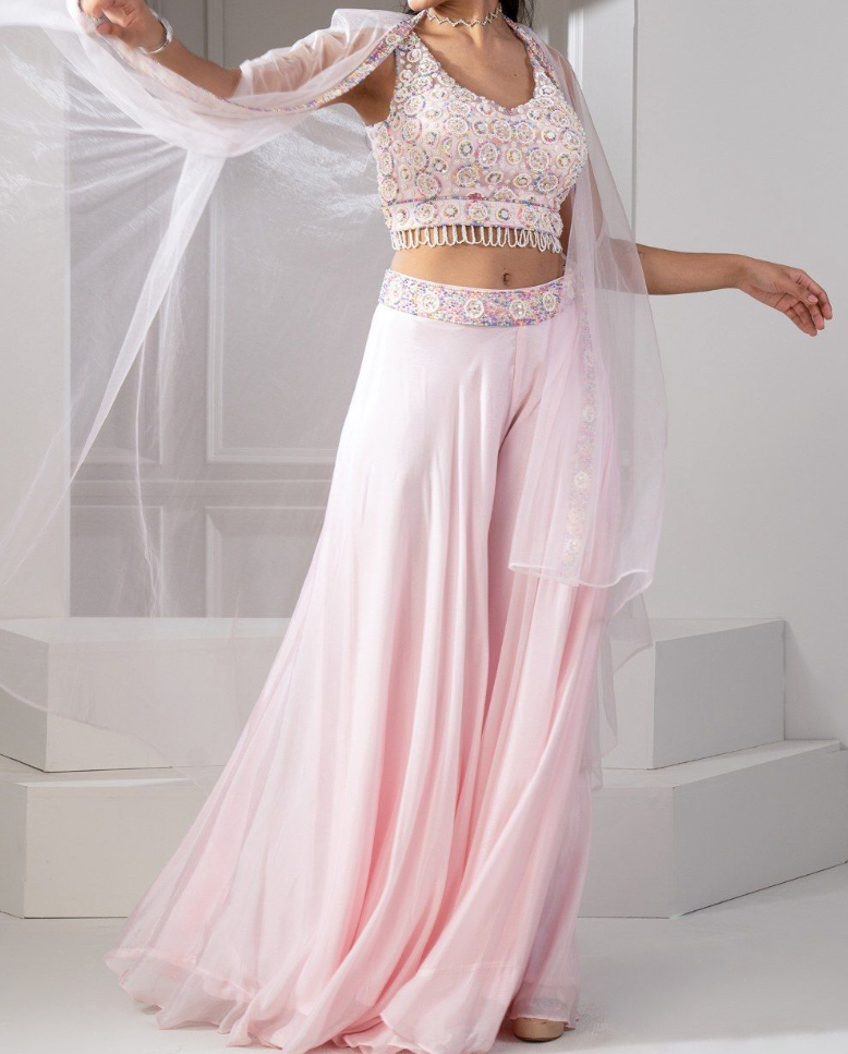 Embroidered Embellished Cutdana Pure Silk Lehenga Sharara Blouse Dupatta Set In Soft Pink