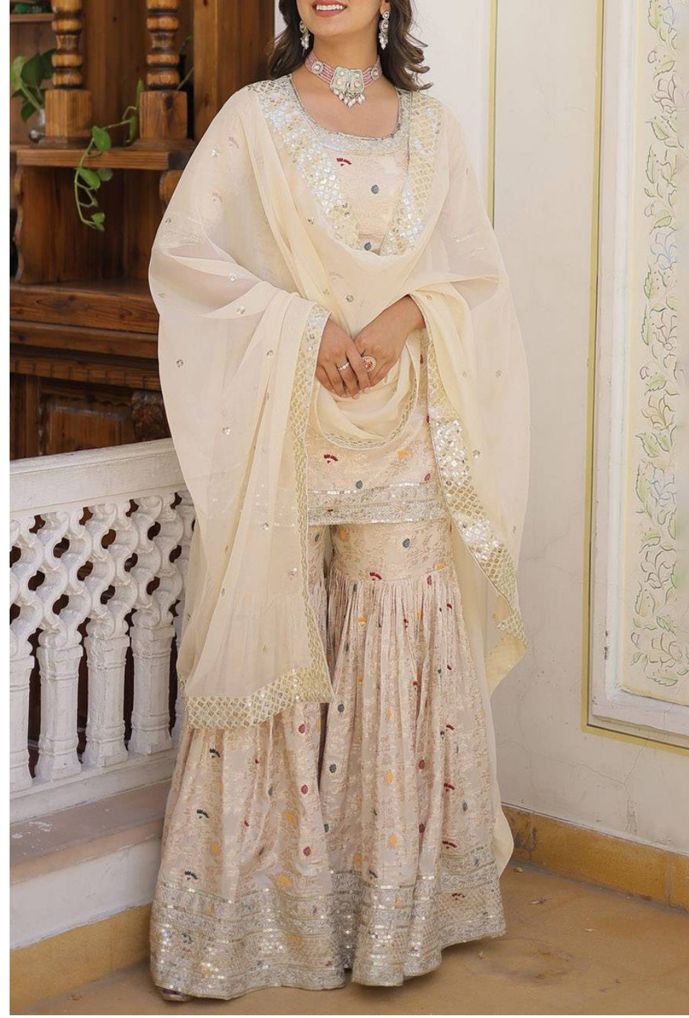 Floral Embroidered Self Design Woven Polyster Sharara In Cream