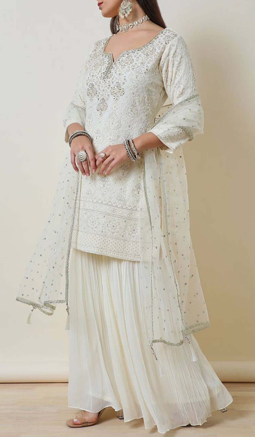 Sharara Is A Pair Of Loose, Flaired And Wide Legged Trousers Mostly Worn With Straight Kurti. It Is Even Teamed With A Designer Anarkali Kurti. A Dupatta Completes This Three-Piece Ensemble. It Is Similar To Modern Day Wide Legged Palazzo With The Difference That Sharara Is Embellished With Zari, Sequins, Stones And Beads Work