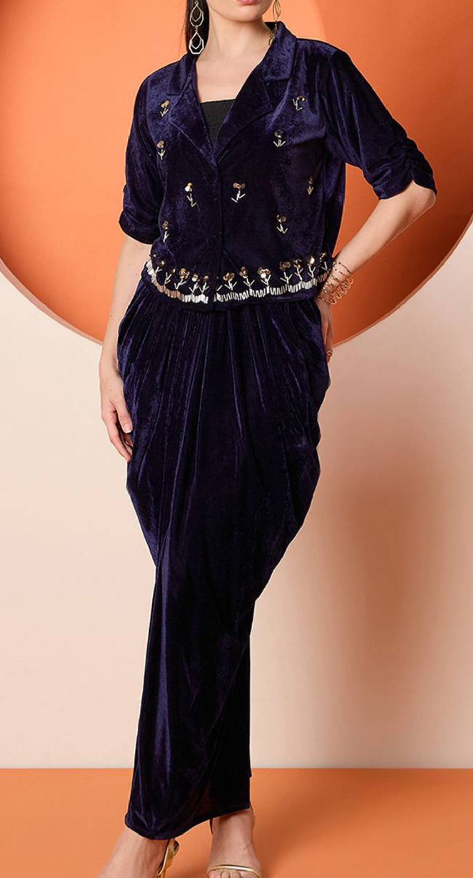 Midnight Blue Velvet Co-ord Top and Dhoti Skirt With Jacket
