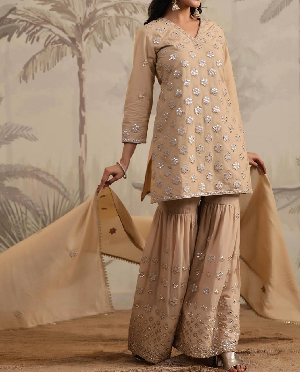Sharara Is A Pair Of Loose, Flaired And Wide Legged Trousers Mostly Worn With Straight Kurti. It Is Even Teamed With A Designer Anarkali Kurti. A Dupatta Completes This Three-Piece Ensemble. It Is Similar To Modern Day Wide Legged Palazzo With The Difference That Sharara Is Embellished With Zari, Sequins, Stones And Beads Work