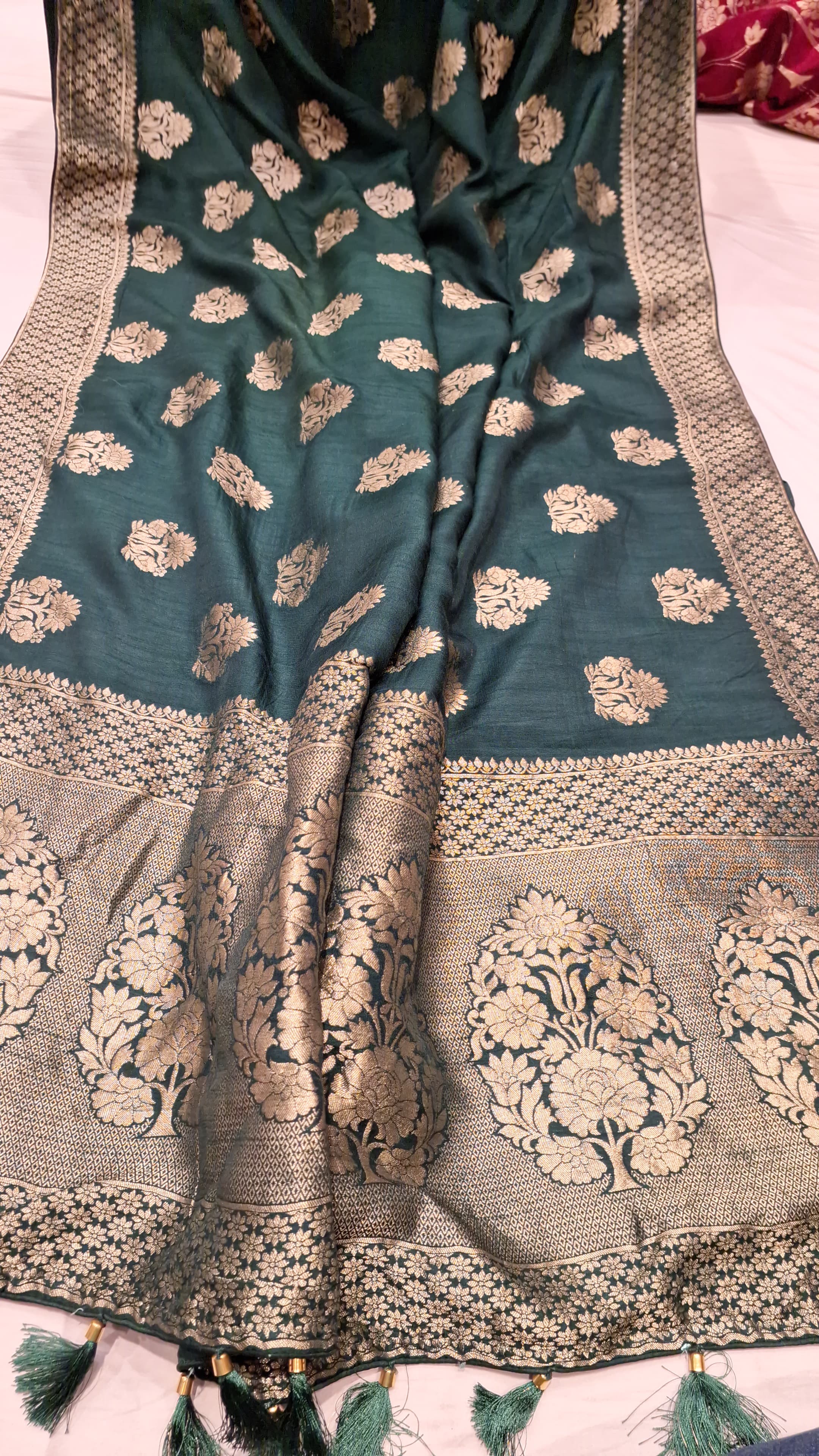 Also Known As Beige Pashima Moonga Silk Saree. These Saris Are Among The Finest Saris In India And Are Known for Their Gold And Silver Brocade Or Zari, Fine Silk And Opulent Embroidery. The Saris Are Made Of Finely Woven Silk And Are Decorated With Intricate Design. Because Of These Engravings They Are Relatively Heavy.
