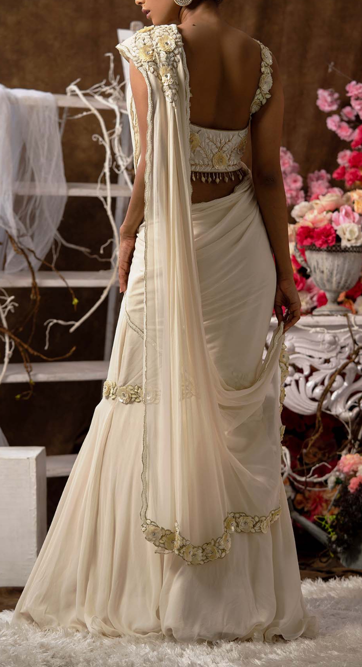 Premium Quality High End Ivory Embellished Lycra Georgette Zardosi Work Ready Wear Saree With Blouse, Belt & Bag