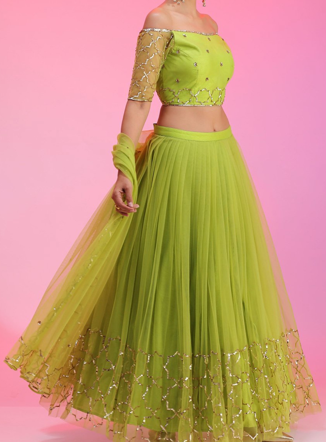 Premium Quality High Range Net Sequin Lehenga Set In Neon Green