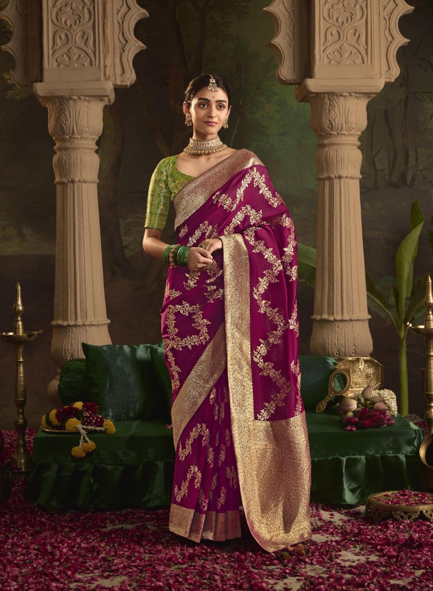 Pure Crepe Dola Silk Banarasi Style Saree Wine With Olive Green Multicolor Blouse