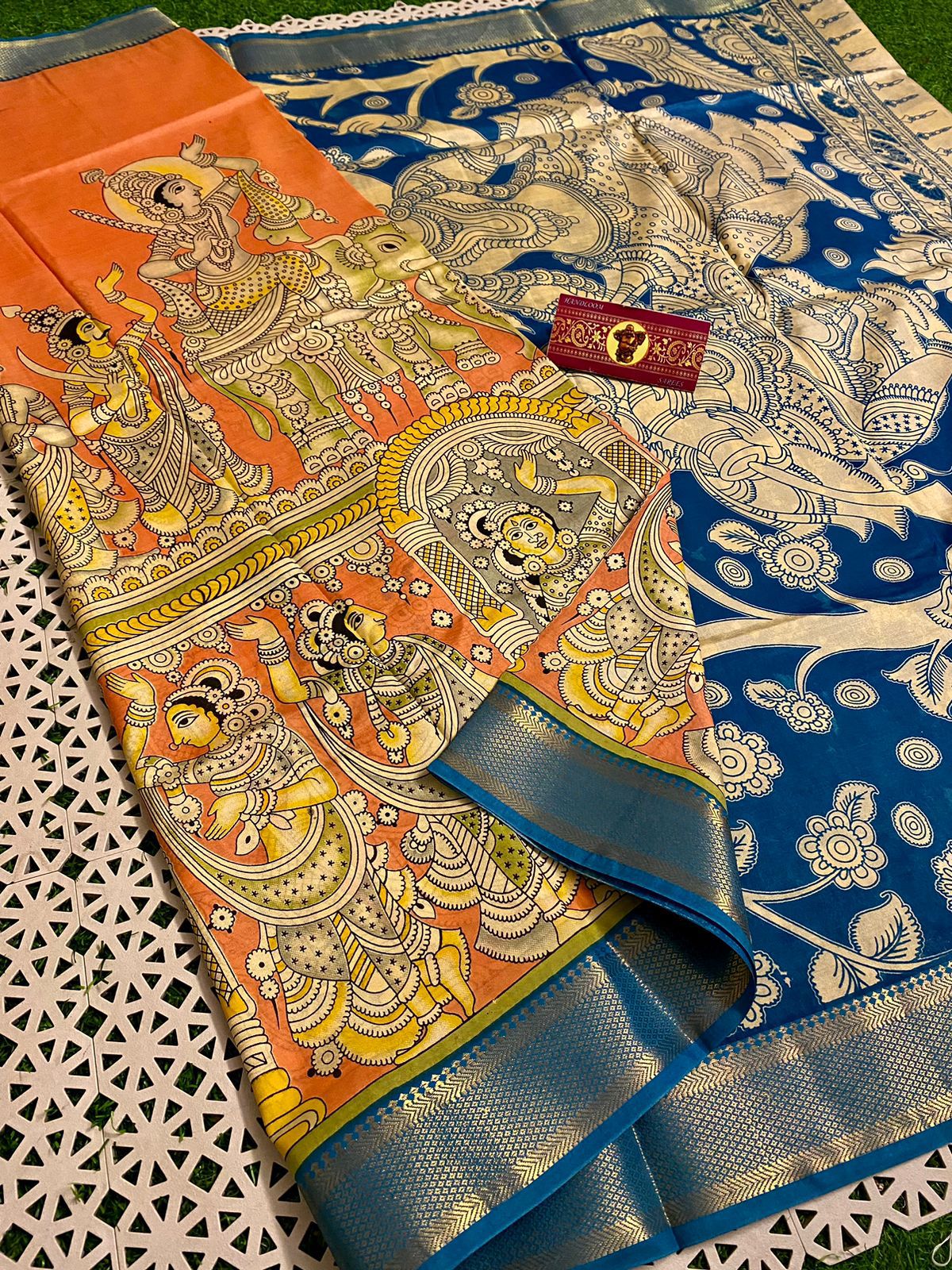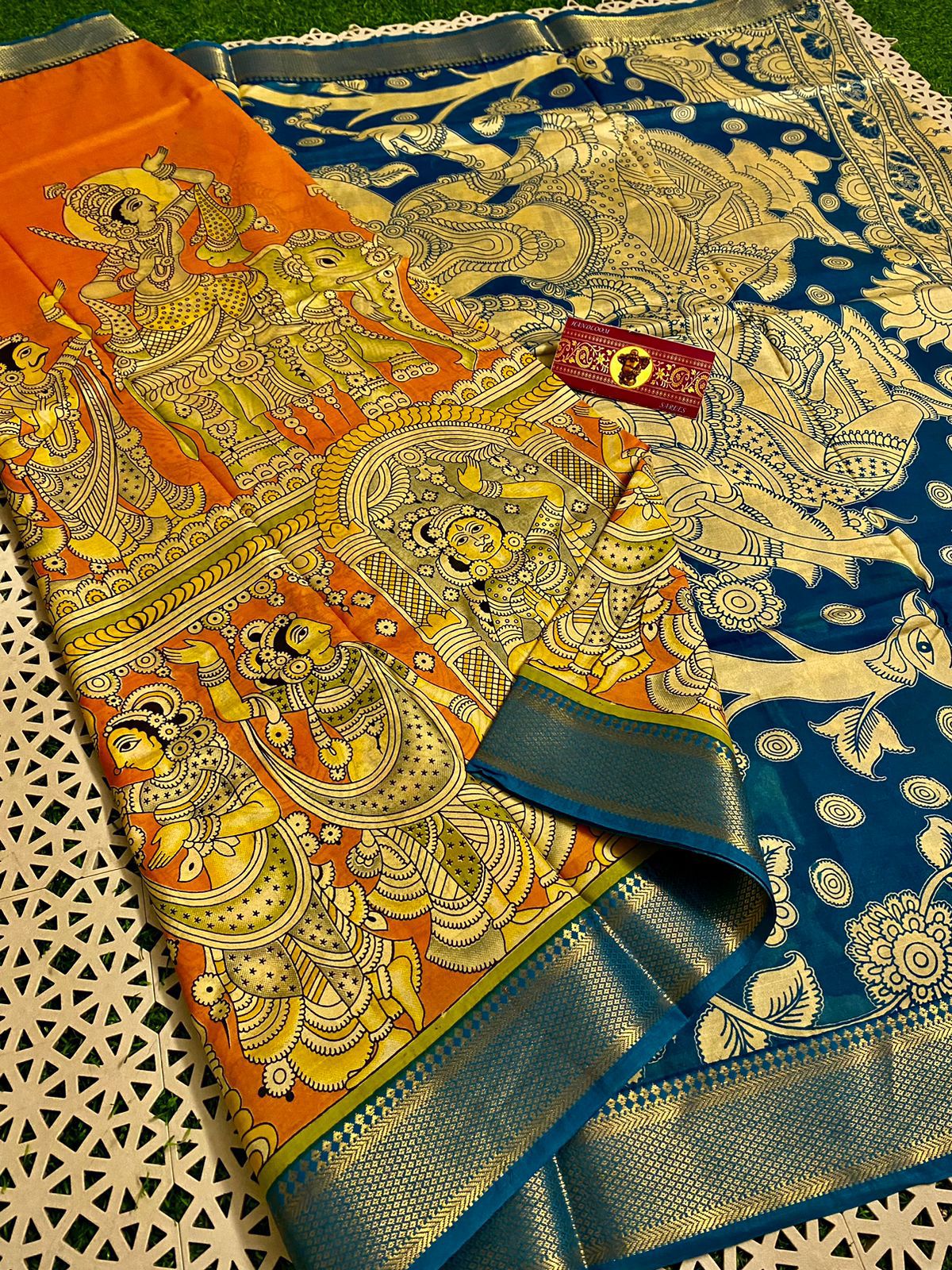 Pure Kalamkari Silks Embrace Saree In Orange-Blue Combination. Comes With Stitched Blouse