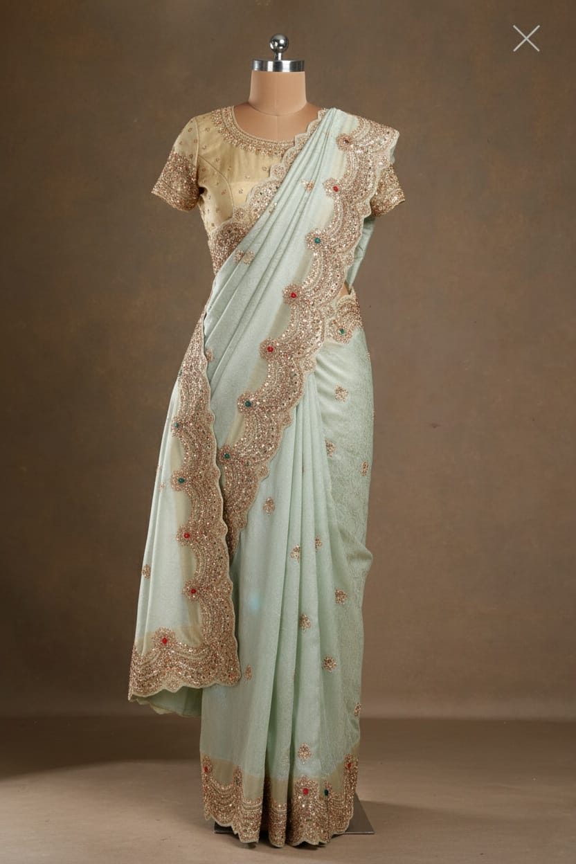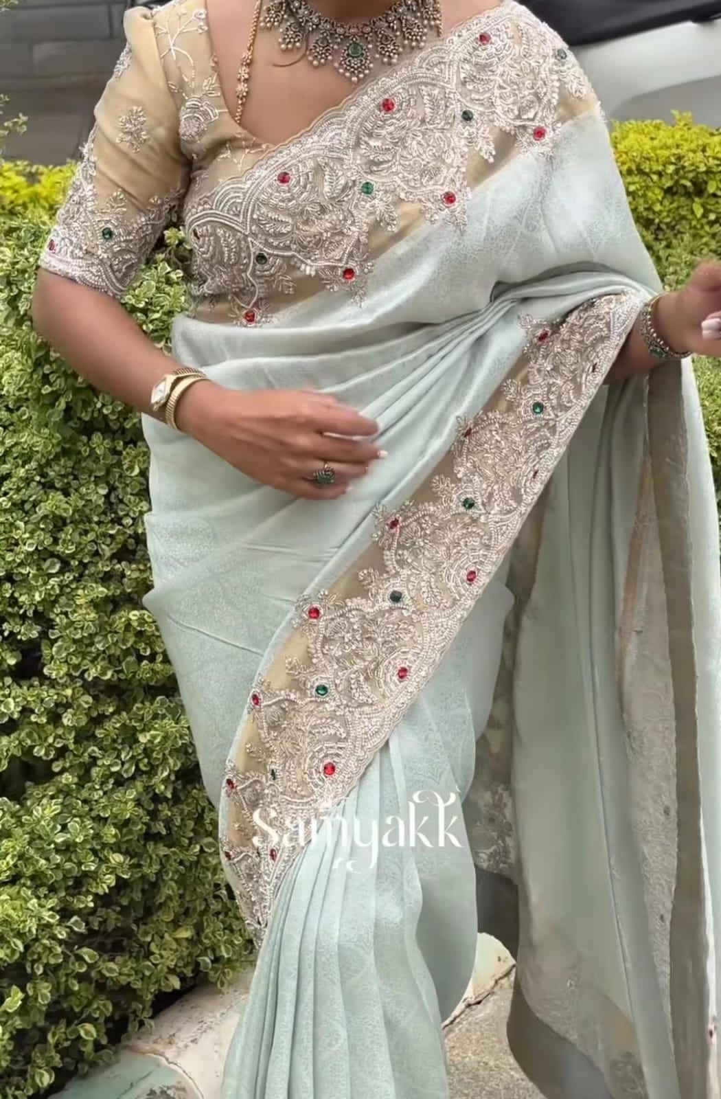 Pure Kanjeevaram Brocade Saree In Powder Blue With Stitched Blouse