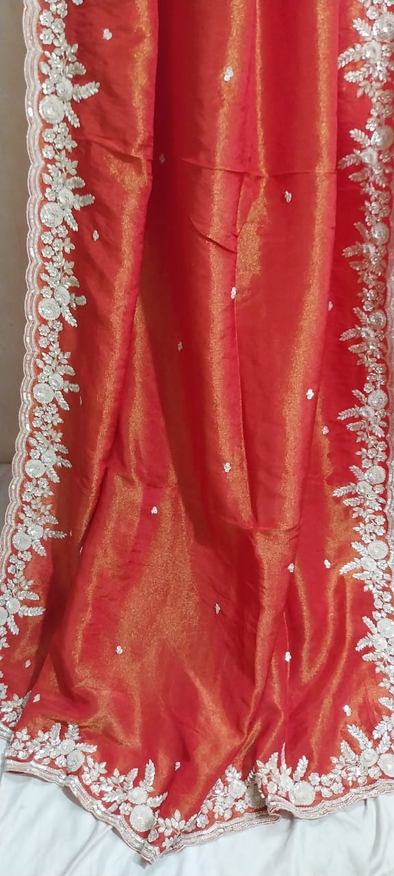 Pure Tissue Georgette Hand Work Saree In Coral With Designer Stitched Blouse.